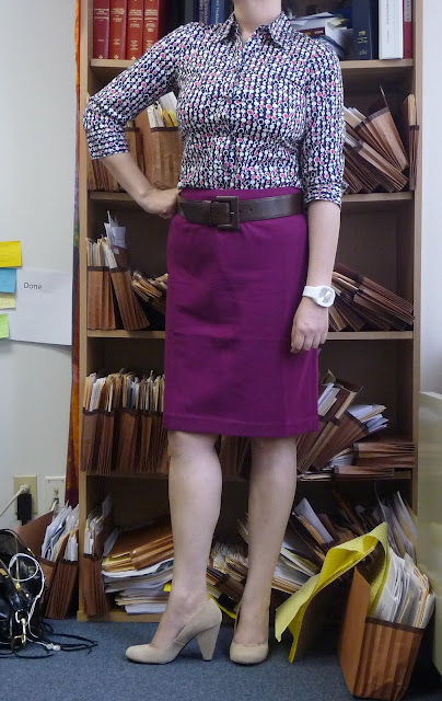 Thanks to everyone who made styling suggestions for this skirt (and a special thanks to the person who gave away this bad boy - keep cleaning your closet!) Since I am apparently without solid colored shirts (NTS - fix this stat), I ended up playing it very safe with a simple black cotton sweater and black pumps. I love this skirt and expect to get a lot of wear out of it this spring. I have been on the fence about these shoes but I am glad I kept them. What do you think?